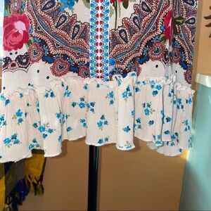 Sleeveless boho top features front and back print with ruffle high low hemline, rope tassel tie.