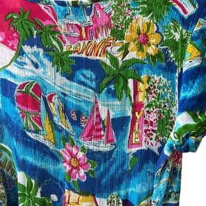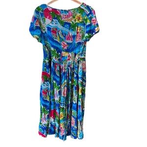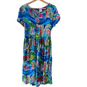 Bila Blue Tropical Cannes Novelty Print Bohemian Semi-Sheer Midi Dress L