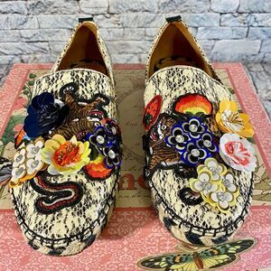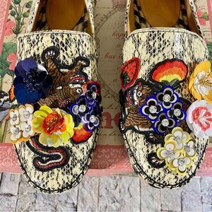 The classic flat is reimagined with a collection of colorful appliqués, snake embossing and striped jute trim for a look with plenty of panache.