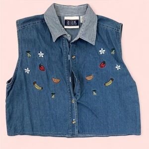 Chic sleeveless denim top. Features playful fruit embroidery. Button-up front. Striped collar detail.