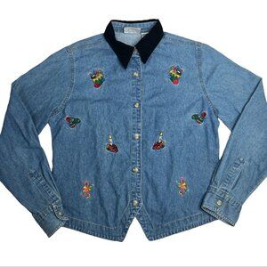 Bill Blass Denim Button Down Velvet Embroidered Christmas Kitschy Womens Sz M