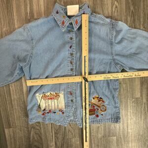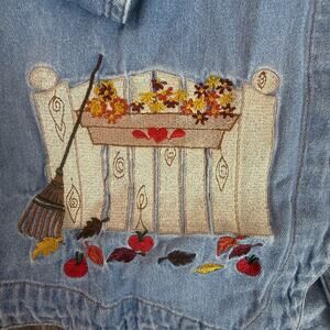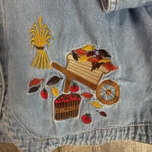 Authentic Bill Blass denim shirt with embroidered fall motifs (leaves, wheelbarrow, apples) on front panel and collar. Button-up style with full front buttons and classic collar. Medium tag visible. Light wash denim with a flattering relaxed cut. Great for layering or as a standalone statement piece in seasonal wardrobes