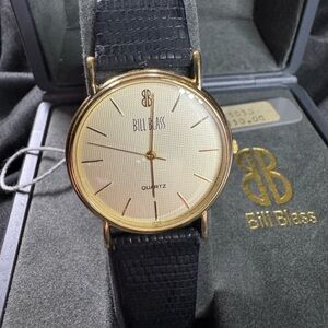 Vintage stylish watch by Bill Blass. Gold case with a textured leather black strap. Quartz movement.