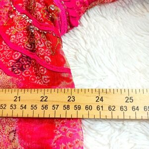 Bill Blass Jeans Vintage Sheer Embellished Tunic/ Midi Pink Printed. Women's 2X (runs smaller, see measurements) tie back, embellished with beading, pleated ruffles, square neckline.
