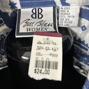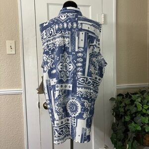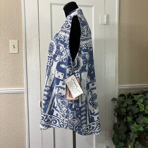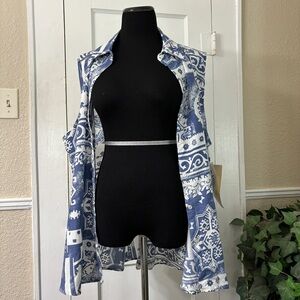 Blue & White, collard, sleeveless, buttons down. Cool summer vibes, soft material, comfortable, wear buttoned up or open with underwear shirt under. Great with jeans skirt or pants!