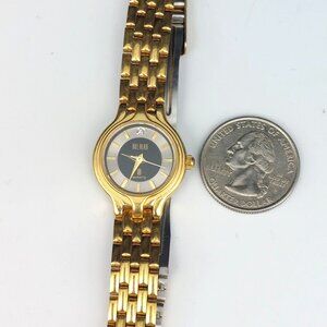 This vintage Bill Blass watch features a gold-tone stainless steel band and a black dial accented with a diamond. A timeless piece for the discerning collector. New Battery works.