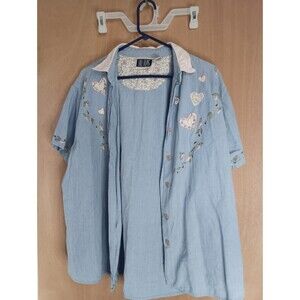 Bill Blass Women's Denim Button-Up Embroidered Heart & Flower Design - Size XL