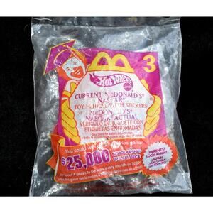 Still sealed in package with all decals, vintage 1999 McDonald's Happy Meals #3 toy. Mattel Hot Wheels diecast 1:24 scale metal model of Bill Elliott's McDonald's Drive-Thru Ford Taurus NASCAR racer from that season.