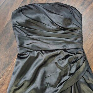 BEAUTIFULLY classic black satin strapless dress that has very flattering pleating.