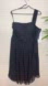 Beautiful one shoulder, pleated bodice with English net a line skirt. Built in cups. This one-shoulder black dress works well for anything from a fancy cocktail event to a wedding. The one shoulder draping sits lightly on the shoulder while the gathered skirt allows for movement and a slight flare.