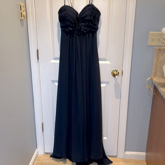 This is a Bill Levkoff long navy blue dress that was worn once as a bridesmaid dress. It could easily be worn for a prom as well. It is 100% polyester both the shell & the lining.