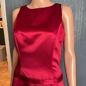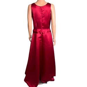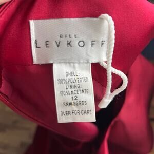 This Bill Levkoff sleeveless formal satin maxi gown is new without tag. Brilliant ruby red color. 100% polyester shell, with an acetate lining and crinoline layer for a full fit and flare design. Dropped waistband. Dry clean. Elegant, perfect for a prom or ball, ballroom dancing, pageant, cocktail party, bridesmaid.