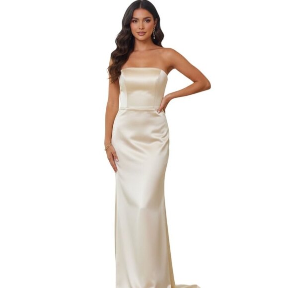 Bill Levkoff Strapless Champagne Satin Evening Gown 4 Column Wedding Black Tie