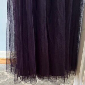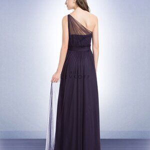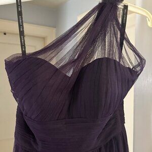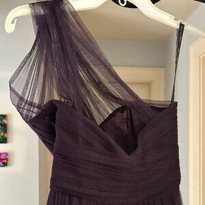 Gorgeous bridesmaids dress that would make for a perfect prom or dance dress, too! Worn only once. EUC. Discontinued style by Bill Levkoff. Hemmed for 5'4 in 3" heels. Tulle overlay with sweetheart neckline and one shoulder tulle detailing. Wide ruched band at waist. Style #82955 in a deep purple color.