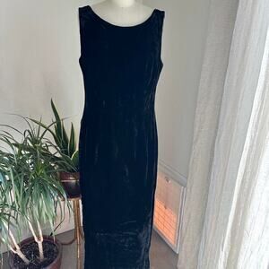 Elegant vintage black velvet maxi dress featuring a sleek sleeveless silhouette and luxurious crushed velvet texture. The front offers a timeless scoop neckline, while the back stuns with a dramatic deep V cut, accented by a satin ribbon bow that ties at the waist. Finished with a back slit for ease of movement. Perfect for evening events, holiday parties, or formal occasions.