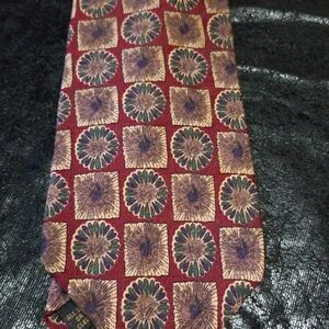 All Silk Vintage Wide Tie in Burgundy, Tan, Green and Blue. Playful Floral and Geometric Pattern