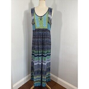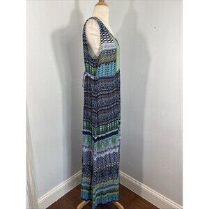 The Billa Maxi Dress is a whimsical and colorful women's dress featuring a scoop neckline and tie closure. This long, tiered dress is perfect for various occasions such as travel, weddings, parties, and more. Made with knit fabric and adorned with layered sequins, this dress has an empire waist and a tropical floral pattern, giving it a fairylike and playful vibe. The dress is machine washable, making it easy to care for, and is available in size M, making it a versatile and stylish choice for any season.