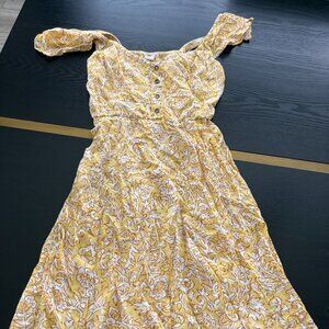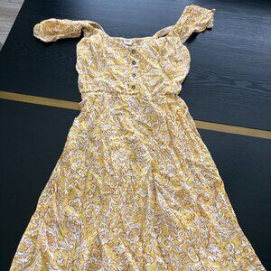 BillaBong yellow sundress. Size XS. Excellent preowned condition. Four button embellishment on front. Elastic waist measures 13" un-stretched. Full elastic panel across back. Approx. measurements: pit to pit 14.5", shoulder to bottom 30". No fabric content on dress.
