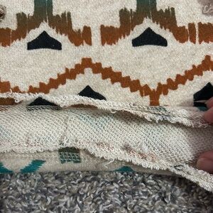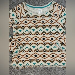 Billabong Aztec like design sweatshirt tan, brown, turquoise and black. Cute and fun colors. Raw hemline and cuffs