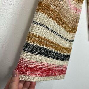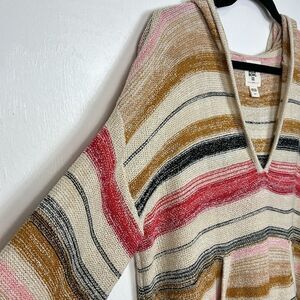 Colorful stripes pattern a cozy sweater-knit hoodie that's perfect for seaside hangs with its roomy fit and wide sleeves