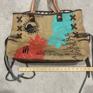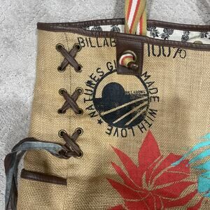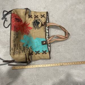 Billabong Beach Bag School Tote Burlap Leather Lined Zipper Pocket Boho Surfer
