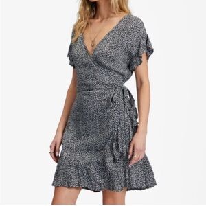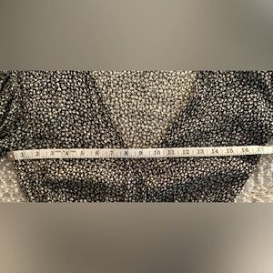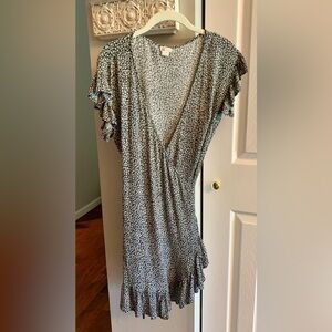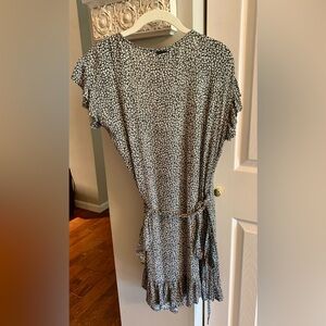 This chic sundress features a flattering V-neckline and flutter sleeves, perfect for a night out or cocktail event. The wrap design with a waist tie and ruffled hem adds a playful touch, while the black and white floral pattern keeps it timeless and versatile. Comfortable summer dress to wear with sandals or paired with heels. Very nice condition. Worn once. Measurements are approximate.