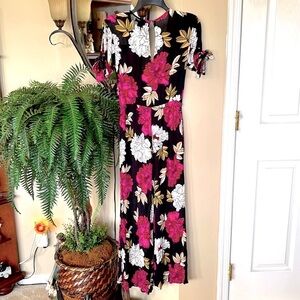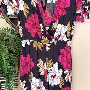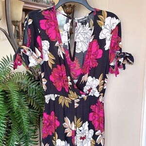 Billabong Black w/ Pink & White Floral Jumpsuit Bow Tie Sleeves Cinched Waist.