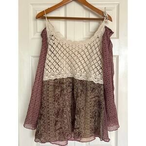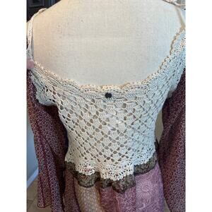 Sheet sleaves with crocheted bodice that ties at the shoulder. The sleaves hang below to create a sexy, hippie vibe