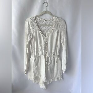 This cream-colored romper is perfect for a casual, bohemian chic look. The long-sleeve romper features a V-neckline with delicate crochet detailing around the shoulders and a button-down front. The lightweight, flowy fabric and elasticized drawstring waist create a comfortable and flattering fit. Ruffled hems add a touch of femininity to the romper, making it ideal for spring and summer outings.