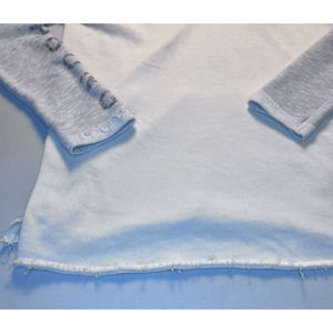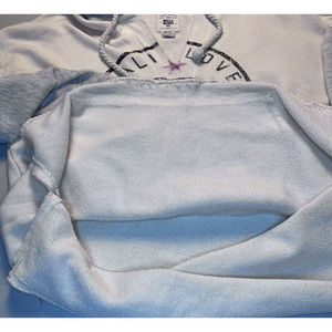 Preowned garment clean and in good condition. No flaws other than material tag is missing. Hooded Kangaroo pocket. Distressed frayed hem and sleeve cuffs.