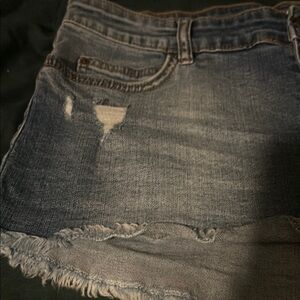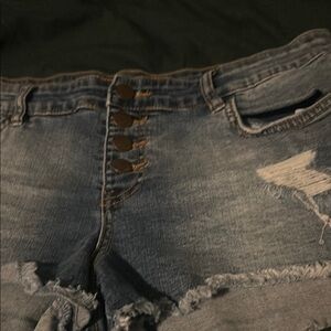 Chic distressed design with frayed edges. Button-up front for a modern look. Perfect for casual outings.