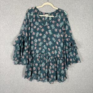 Billabong Dress XS Blue Floral Ruffle Tiered Boho Peasant Flowy Stevie Sunday Bohemian Hippie Chiffon Pleated Cottage Sheer Mini Short Shift Western Cowgirl Rodeo Bell Flare Long Sleeve