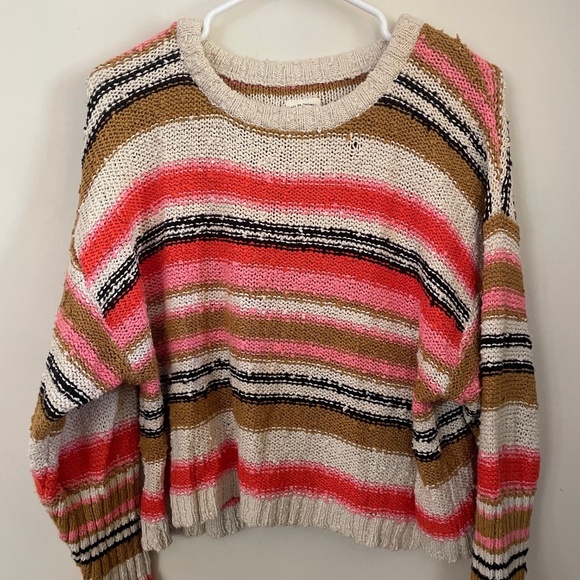Fun summer sweater; pairs well with denim shorts! Barely worn. Please note very small snag. Color: cream, pink, mustard. Size medium. Slightly boxy. Long Sleeve Scoop Neck Feature: Comfort, Breathable Closure: Pullover Theme: Classic Occasion: Casual Country/Region of Manufacture: China Condition: Pre-owned, Excellent Condition