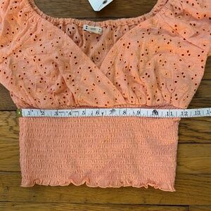 Peach eyelet crop top with wide elastic band by Billabong. Beautiful peach color, size medium/10. Still has tag and has never been worn, this top is in excellent condition. Can be dressed up or worn with a cute pair of jeans. Fun little top.