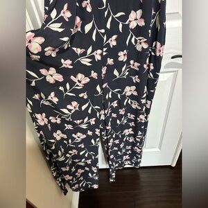 Chic navy jumpsuit with elegant pink floral design. Ideal for versatile styling.
