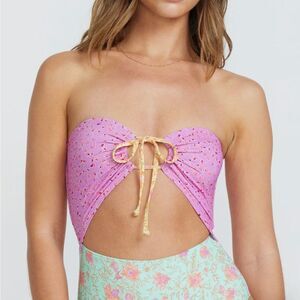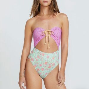 A dreamy floral print with vintage appeal, this one-piece ties at the center front with a flirty keyhole and cut-out detail, while removable adjustable straps let you customize your look.