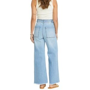 Stylish wide-leg jeans in light denim. Features a frayed hem for a trendy look.