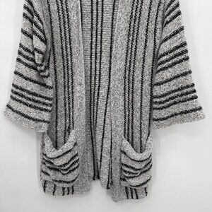 Cozy Billabong open-front cardigan in a gray and black striped knit. Relaxed fit with wide sleeves and front pockets. Soft and comfy—perfect for layering.