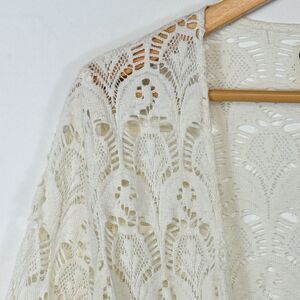 Billabong Ivory Knit Lace Fringe Boho Open Front Cardigan Sweater. 3/4 length sleeves. Women's Medium.