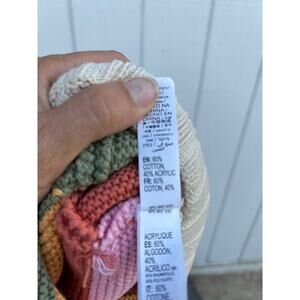 SUPER cute Billabong knit beanie hat with earthy pink, orange, yellow and green stripes on a cream hat. There is one light marking at the top of one part of hat- see last photo.