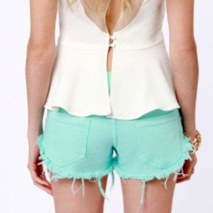 Juniors size 1. Gently used, excellent condition. Mint green denim, frayed cutoff hemlines. 100% Cotton.