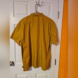 Casual button-down shirt in a rich golden hue. Ideal for relaxed settings. Features a classic collar and short sleeves.
