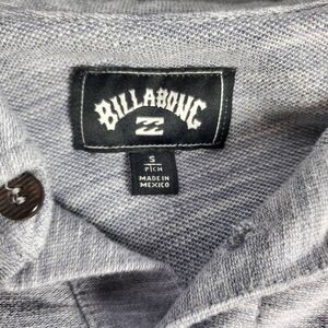 Billabong short sleeve polo shirt, size Small. Heather gray with embroidered logo on chest. Classic collared style with button placket. Made in Mexico, soft cotton blend.