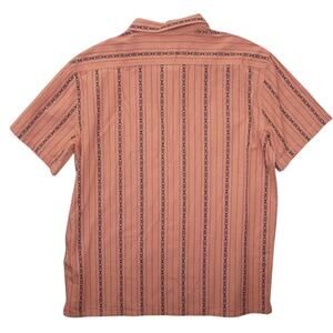 Tribal stripe pattern in rust orange with black geometric vertical stripes. Classic collar, front button closure, and chest pocket with logo tag. Lightweight woven fabric, perfect for summer or casual wear.