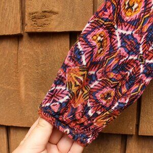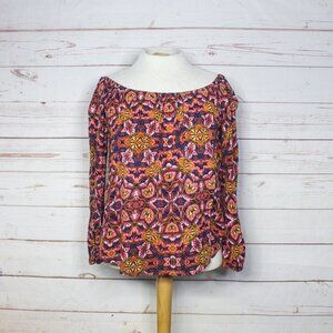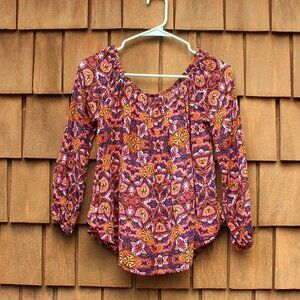 Billabong top, size small. Printed, off the shoulder long sleeve top with rounded hem, elasticized neckline and sleeve cuffs. Oversized / flowy / boho / hippie. Crinkle texture fabric feels similar to rayon or linen, but fabric content / care tag has been removed. Otherwise in excellent, like new condition.