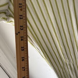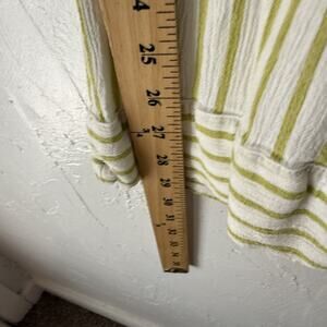 Vertical green and white stripes throughout with horizontal striped detail at hem