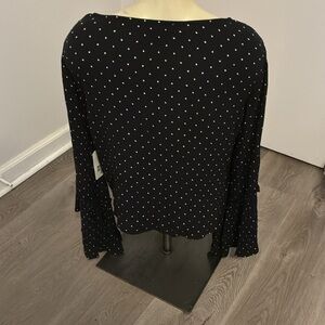 Chic and playful, this Billabong top is perfect for adding a bohemian twist to your wardrobe. It features long flared sleeves, a flattering tie waist, and a button-down front for versatile styling. The black fabric with crisp white polkadots makes it a timeless yet fun piece. Brand new with tags, in perfect condition.
