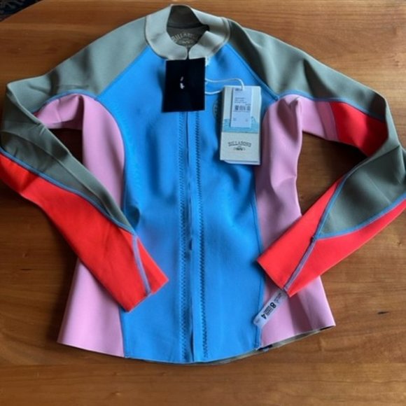 Billabong Peeky Front Zip Jacket/Rash Guard. Size EUR 8. Gray, light blue, pink and orange. I have 3 of these, all are brand new - tags on.