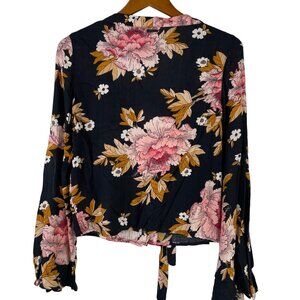 Billabong Shirt Size Medium Floral Crop Flare Sleeve Blouse Button Front Tie Nec