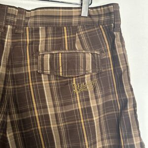 These Billabong Men's Size 38 Brown Plaid Shorts are perfect for a surfer dad or preppy teacher with an 11" inseam. Made from a blend of polyester and cotton chino fabric, these shorts feature a zip closure, mid-rise, and flat front design. The plaid pattern adds a fun and dapper touch, while the pockets provide convenience for everyday wear. Machine washable and ideal for the summer or spring seasons, these shorts offer a comfortable and stylish fit for any occasion.
